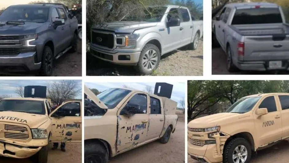 De igual manera otras dos camionetas con blindaje artesanal marca Dodge y Chevrolet, ambas con la leyenda “Marina” en las puertas y costados, y una que enfrente decía “Infantería”, sin placas de circulación y sin reporte de robo.