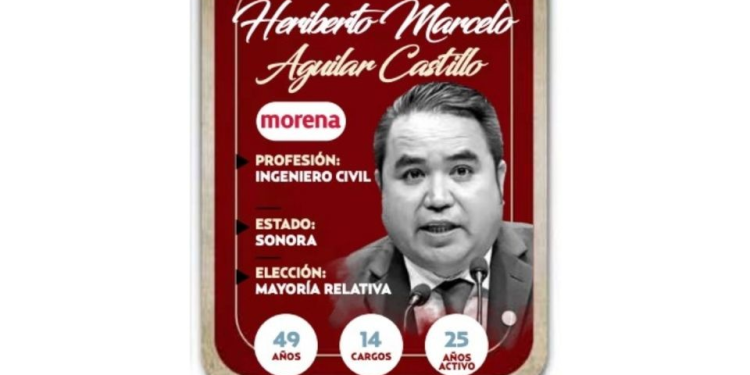Heriberto Marcelo Aguilar Castillo estará en el Senado de la República representando al estado de Sonora, fue elegido por el principio mayoría relativa, es decir, obtuvo el mayor número de votos emitidos en la entidad.