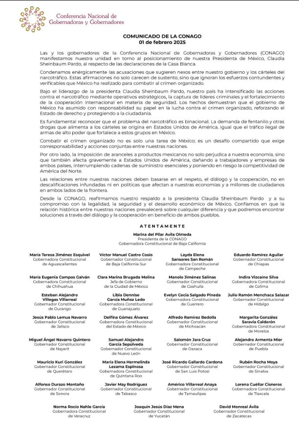 “Respaldamos a la Presidenta Claudia Sheinbaum Pardo ante las declaraciones de la Casa Blanca y rechazamos cualquier vínculo entre el Gobierno de México y el narcotráfico”, señaló la Conferencia Nacional de Gobernadores (Conago) a través de una publicación en su cuenta de X.