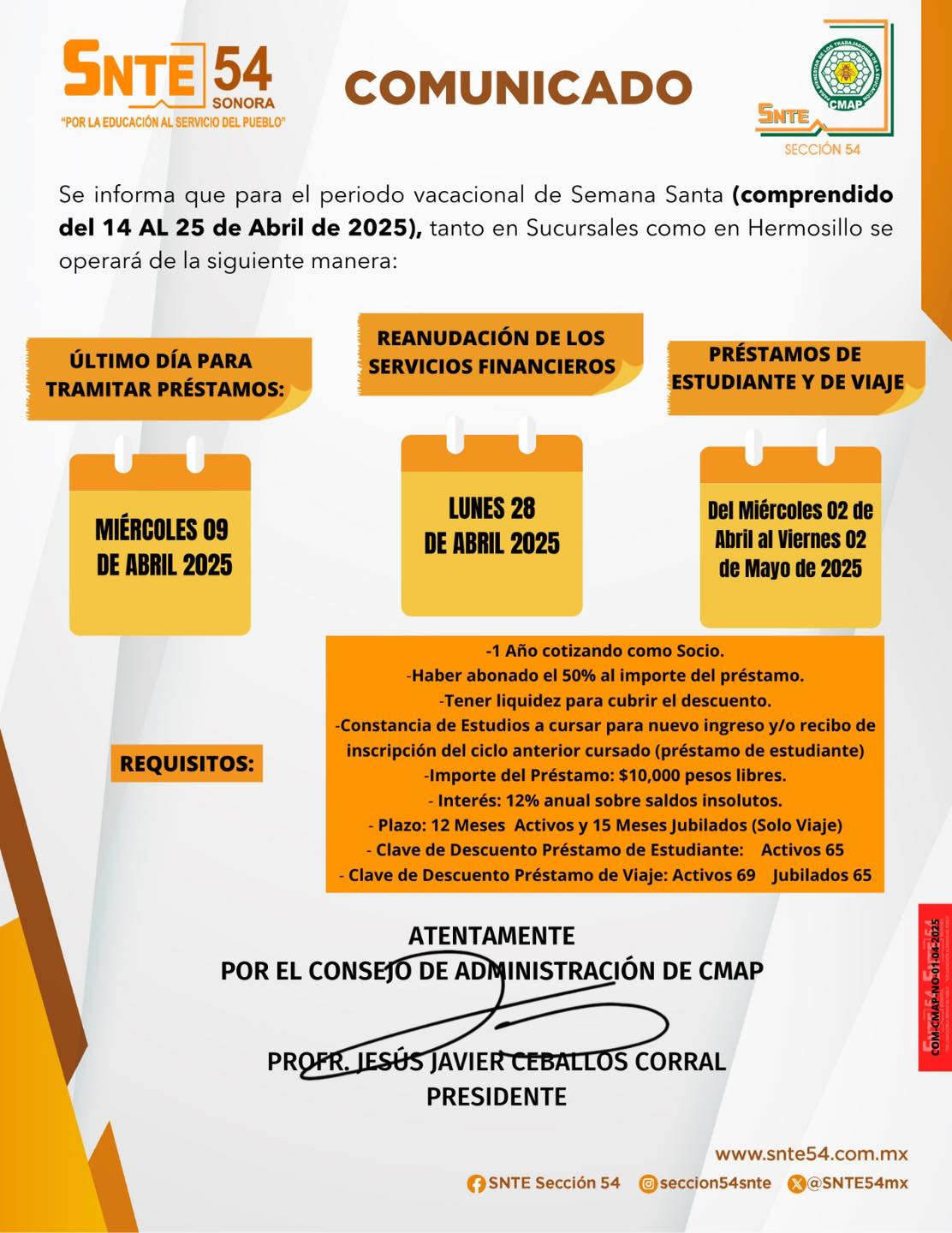 🔸Se informa que para el periodo vacacional de Semana Santa (comprendido del 14 AL 25 de Abril de 2025), tanto en Sucursales como en Hermosillo se operará de la siguiente manera: