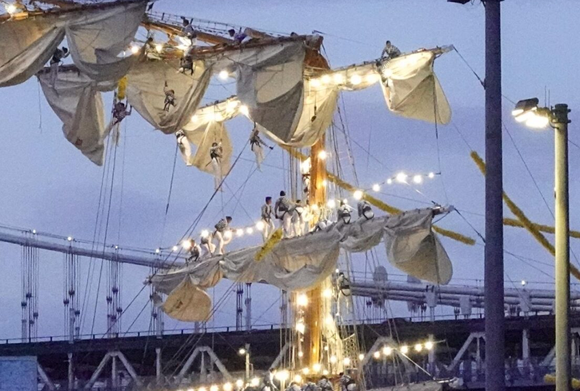 Según imágenes grabadas por testigos y compartidas en redes sociales, los tres mástiles del navío se rompieron uno tras otro al chocar contra el puente, y el barco avanzó hacia un muelle que se encuentra en su base; también se observaba a un grupo marinos subidos en la borda.