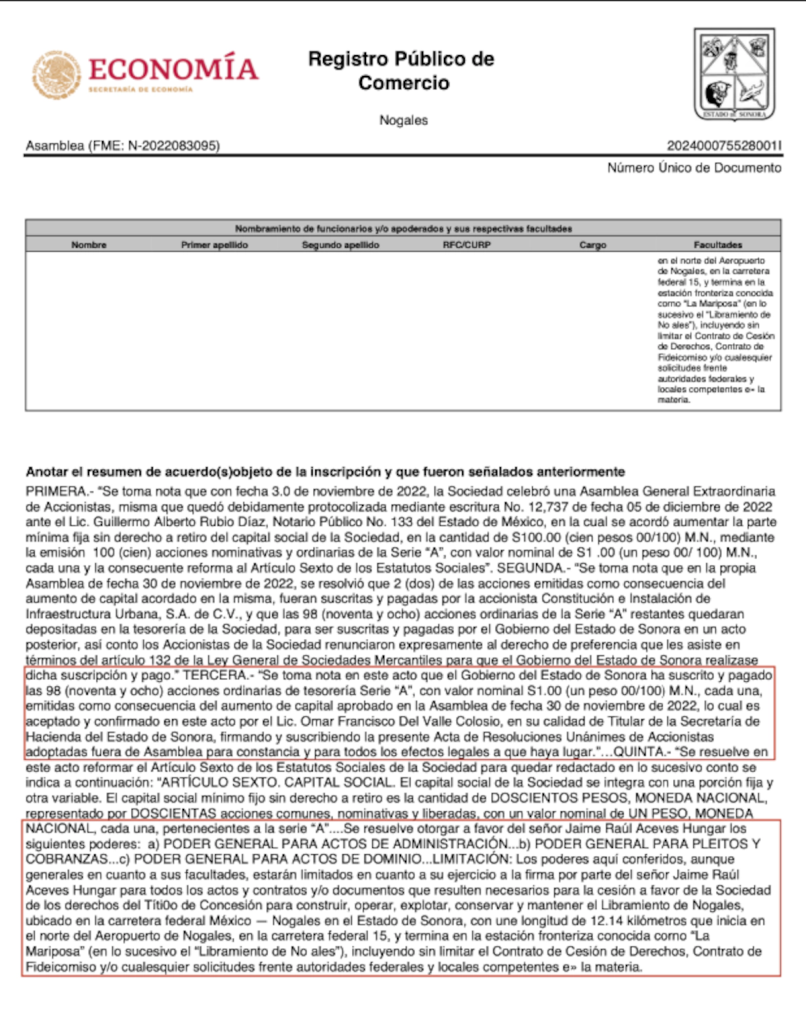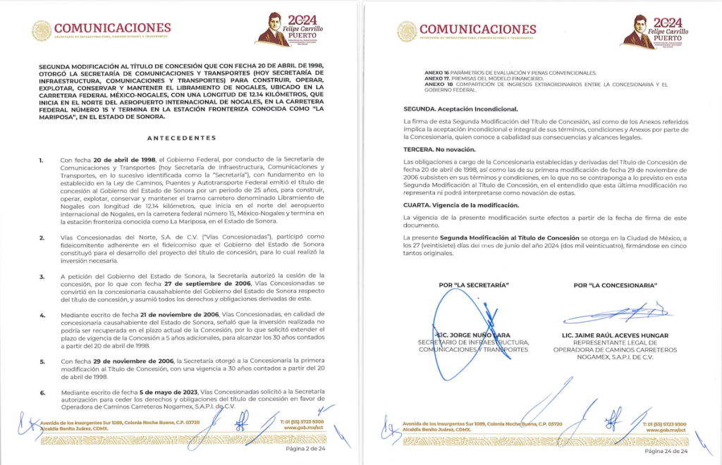 El 25 de noviembre de 2022, un día después del anuncio del Plan de Infraestructura Concesionada para el Estado de Sonora, se constituyó la sociedad Operadora de Caminos Carreteros Nogamex, S.A.P.I. de C.V. (“Nogamex”), en Nogales, Sonora.