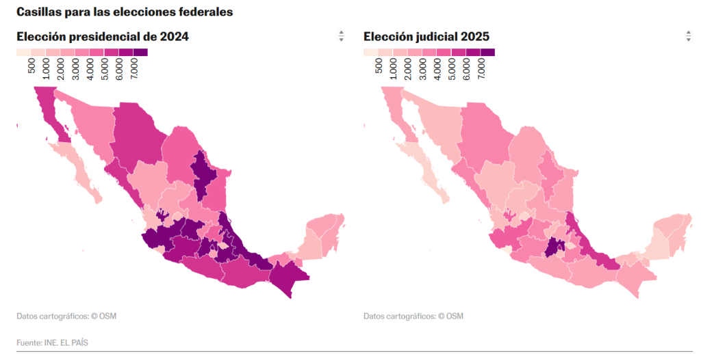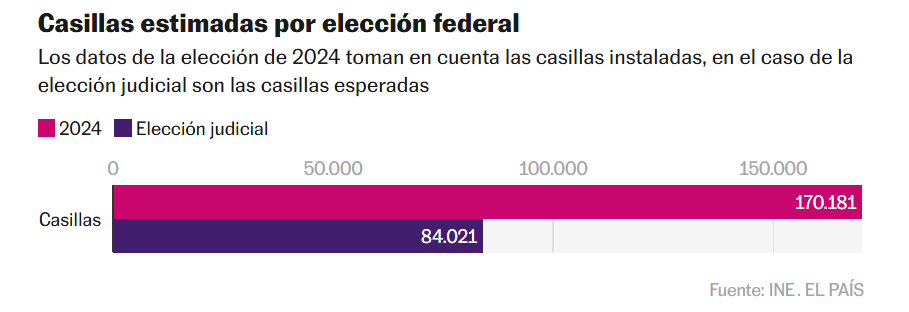 El Instituto Nacional Electoral (INE) ha contado con un presupuesto de apenas 800 millones de pesos para organizar la elección judicial, mientras que para los comicios federales del año pasado ascendió a 8.800 millones, 10 veces más. Esta reducción de los fondos va a tener un impacto directo en las casillas electorales: mientras en 2024 instalaron unas 170.000 en todo el país, la nueva jornada electoral solo contará con 84.000 casillas, es decir, menos de la mitad.