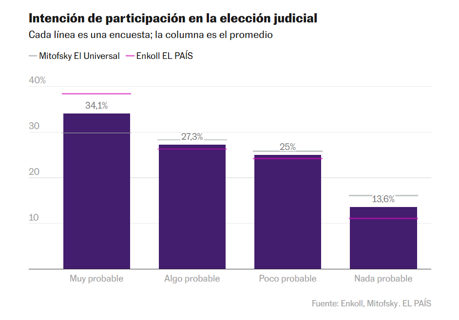 Los expertos en temas electorales y judiciales acortan las expectativas de las encuestas. “Creo que van a tener una participación menor a los dos dígitos”, apunta el investigador de la UNAM, Josafat Cortez. “Se habla de un 10%, que sería una participación bajísima, sería un poder judicial ilegítimo”, añade el abogado Luis Tapia. “Yo no creo que sea tan baja como en la consulta popular porque ahí no estaba nada en juego, aquí sí hay incentivos de grupos muy variados, desde los grandes intereses económicos hasta del crimen organizado, para movilizar”, cuenta Javier Martín Reyes, “creo que terminaremos en un escenario intermedio entre el 7% y el 40% de una elección intermedia”. Los especialistas desgranan los principales factores que van a afectar a la participación, desde la falta de presupuesto, la complejidad y las propias exclusiones a los comicios.