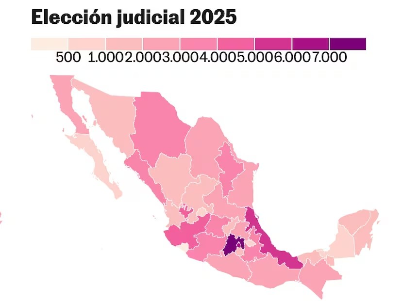 Esta es una elección inédita en México, por lo que es difícil la comparación con otras votaciones. Las elecciones presidenciales suelen tener una participación cercana al 60%, pero esta se reduce al 45% para las elecciones intermedias, que nombran a diputados. Este porcentaje se hunde en otros ejercicios electorales extraordinarios: por ejemplo, la votación por la revocación de mandato —promovida por Andrés Manuel López Obrador en 2022— tuvo una participación apenas superior al 17%, y la consulta popular sobre si había que enjuiciar a los expresidentes —también auspiciada por López Obrador, en 2021— atrajo solo al 7% de la lista de electores. Estos dos últimos han sido los ejercicios electorales federales con menor asistencia desde 1994.