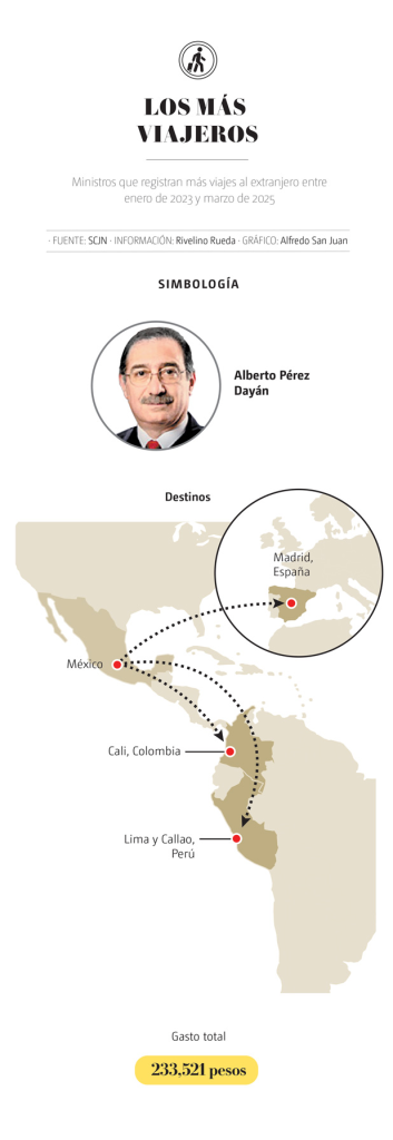El ministro Alberto Gelacio Pérez Dayán, con tres viajes (Lima y Callao, Perú; Madrid, España, y Cali, Colombia).