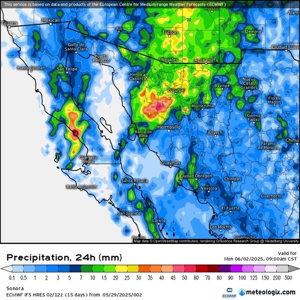 Se pronostican lluvias de moderadas a fuertes, con acumulados estimados de 10 a 25 milímetros en todo el territorio sonorense.