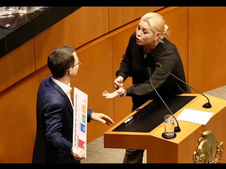 Fue una pancarta que colocaron los guindas y aliados en sus escaños y Farjat en su lugar de la mesa directiva, de la que es vicepresidenta. En la misma se alude a “la hipocresía de la oposición”, que ha señalado que la votación para elegir a jueces, magistrados y ministros fue muy baja, pese a que es mayor a la obtenida por PAN, PRI y MC en el proceso electoral presidencial del 2024.