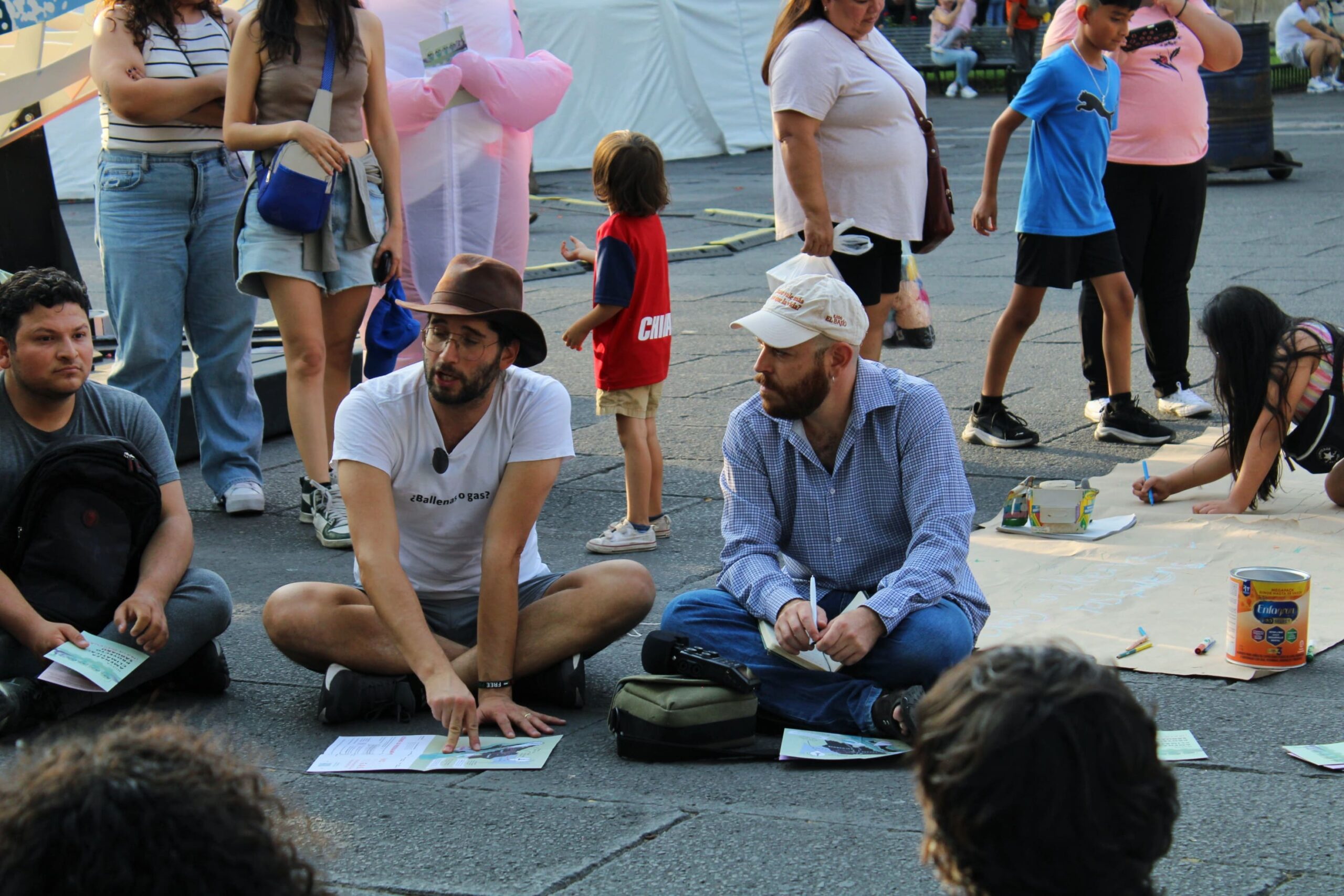 Frente al Teatro Degollado, la escultura gigante de ballena azul fue el punto de encuentro para la “Charla y dibujos en defensa de las ballenas mexicanas”, intervención cuyo objetivo fue visibilizar los riesgos del megaproyecto SAGUARO, una planta de licuefacción de gas que impactaría gravemente al Golfo de California, hábitat clave para la reproducción de ballenas.