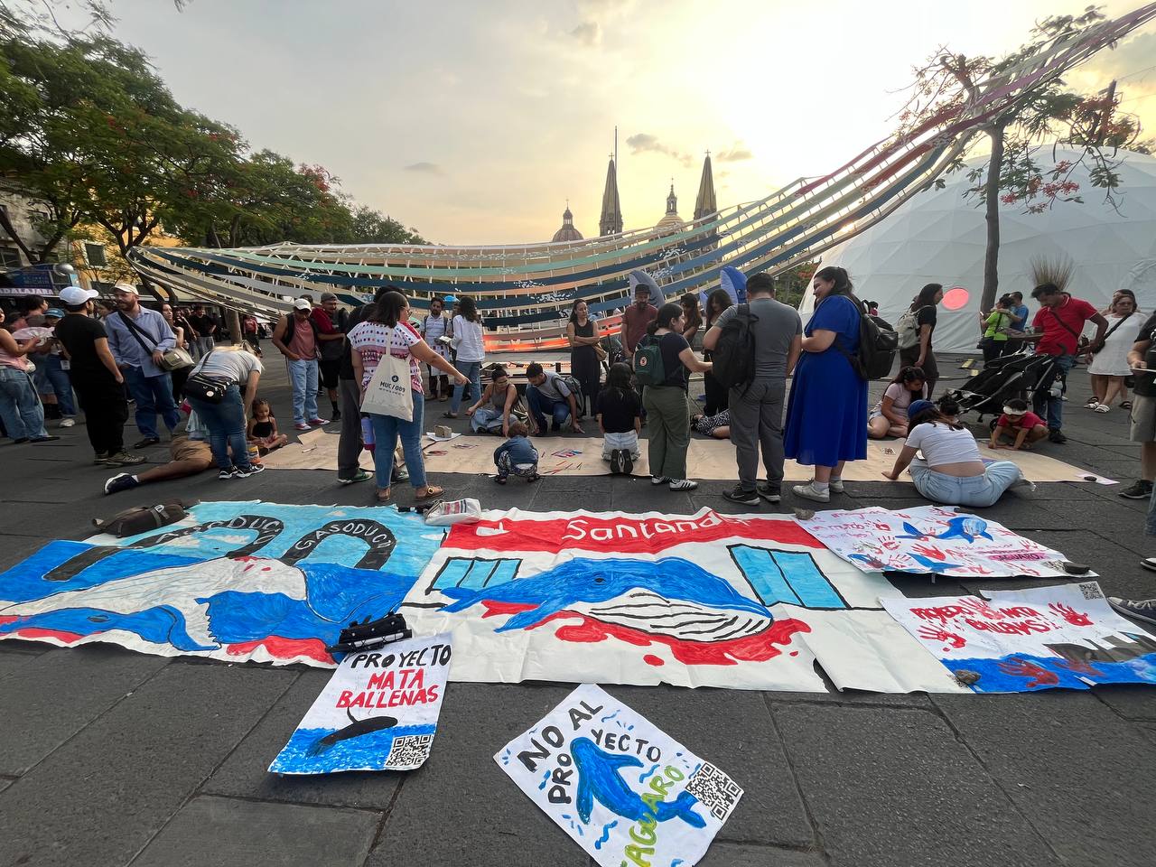 Frente al Teatro Degollado, la escultura gigante de ballena azul fue el punto de encuentro para la “Charla y dibujos en defensa de las ballenas mexicanas”, intervención cuyo objetivo fue visibilizar los riesgos del megaproyecto SAGUARO, una planta de licuefacción de gas que impactaría gravemente al Golfo de California, hábitat clave para la reproducción de ballenas.
