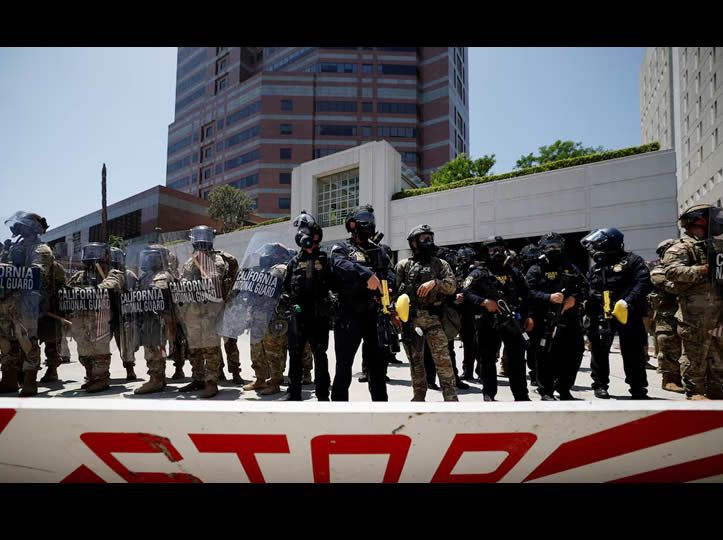 La presencia de los militares de la Guardia Nacional se limita de momento a la vigilancia de un edificio federal en el que se encuentran recluidos los indocumentados detenidos por la policía de inmigración, ICE. Los guardias están armados con porras, escudos antidisturbios y rifles de alto poder. No han chocado con los manifestantes, pero su sola presencia ha tensado las cosas en el centro de Los Ángeles.