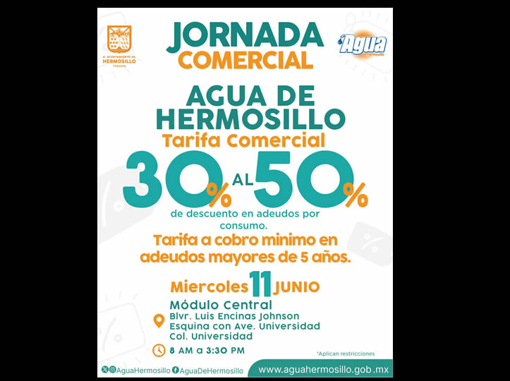 Hermosillo, Sonora a 09 de junio de 2025* .- Con el fin de apoyar a las familias hermosillenses a estar al corriente en el pago de su servicio de agua, así como al sector de negocios establecidos, este miércoles se realizará por primera ocasión, la Jornada Comercial que realiza Agua de Hermosillo.