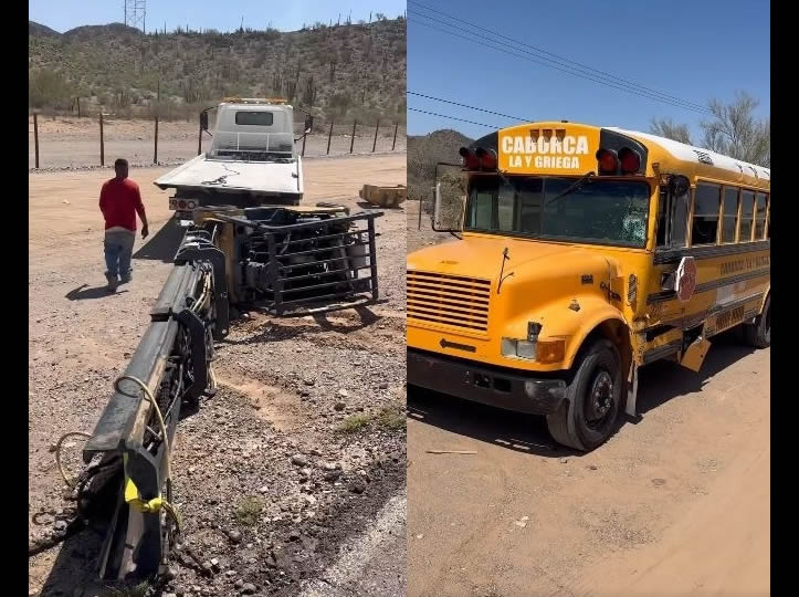 De acuerdo al reporte, alrededor de las 09:30 horas, una grúa circulaba sobre el tramo carretero transportando un montacarga, el cual se desprendió y cayó sobre la cinta asfáltica alcanzando impactar la parte lateral del camión de pasajeros de la ruta Caborca-La Y, con destina a la ciudad de Caborca.
