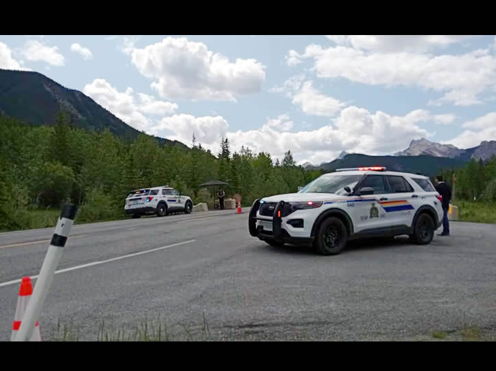 Kananaskis, Canadá.- Elementos de la Real Policía Montada de Canadá resguardan la entrada al pueblo de Kananaskis, sede de la Cumbre del G7, la cual arrancó este domingo y a la cual llegará mañana lunes la presidenta Claudia Sheinbaum Pardo
