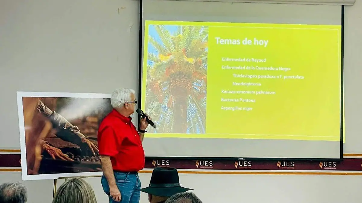 Ricardo Salomón Torres, investigador de la UES y organizador del curso, compartió experiencias sobre el manejo del polen en la palma datilera y tendencias para el mejoramiento de la calidad.