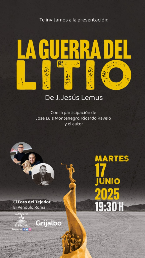 La guerra del litio es una profunda investigación que exhibe cómo el narcotráfico, a través del brutal uso de la violencia, hace el trabajo sucio a las mineras, y es quien se dedica a despoblar las zonas extractivas, refirió en un comunicado la editorial Grijalbo.