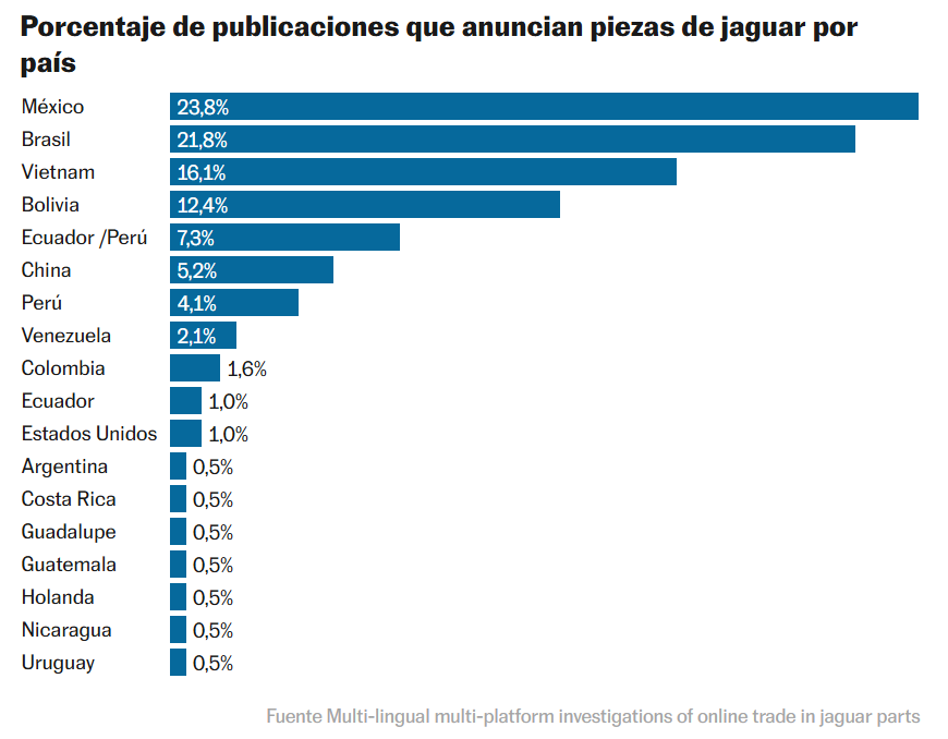 Hasta el momento, la mayoría de informes sobre comercio ilegal de partes del cuerpo de jaguar se centraban en Bolivia, Surinam y China. Era una lógica determinada, ya conocida. Pero cuando la lupa pasó de las grandes incautaciones a lo que se ofrecía abiertamente en Facebook y otras redes sociales, México, con un 23%, se convirtió en el país con más publicaciones vendiendo jaguares o sus partes, seguido de Brasil (21,8%), Vietnam (16,7%) y Bolivia (12,4%).