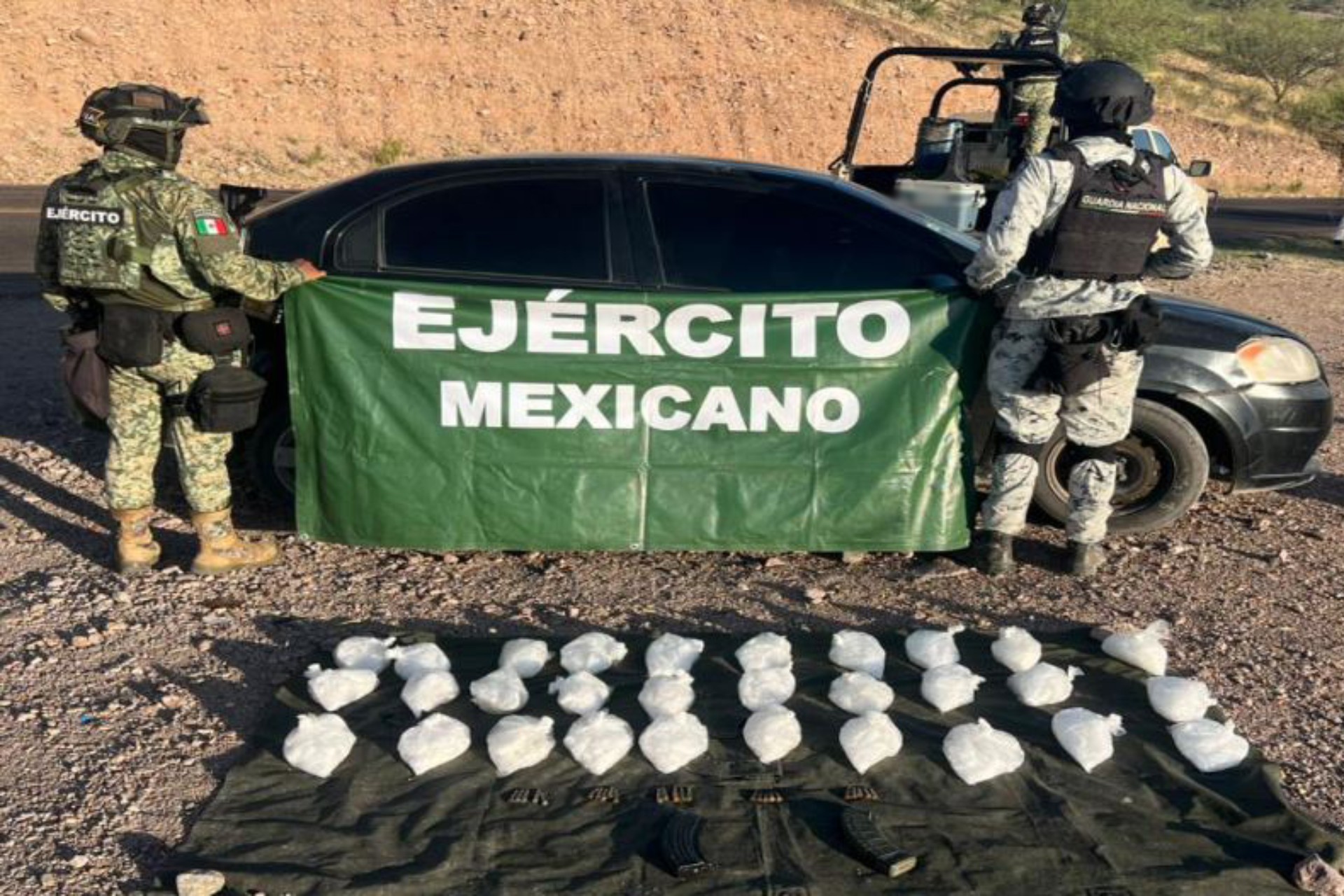 En Nogales, Sonora, guardias nacionales y Ejército mexicano localizaron un vehículo vinculado, asegurando un total de 15 kilos de metanfetamina, con un costo aproximado de 4.1 millones de pesos