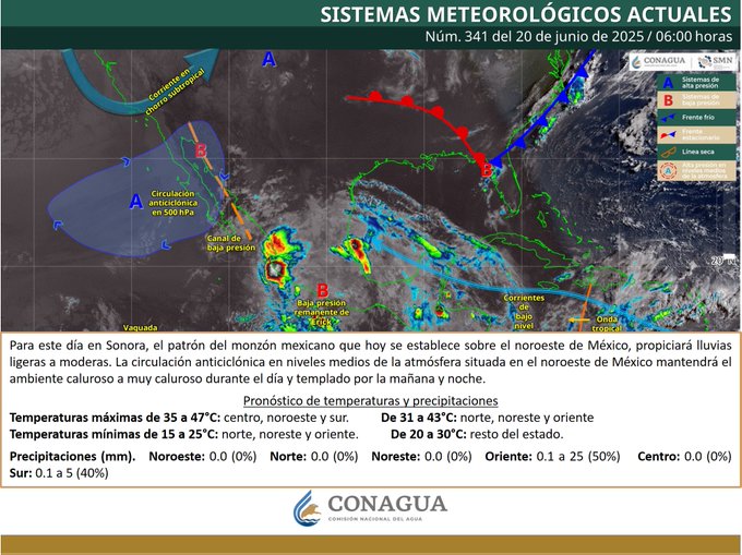 “Se espera que aumente la humedad este fin de semana sobre la zona oriental del estado y genere un potencial de lluvia de un 50 a 60 por ciento en este región de lluvias ligeras a moderadas todo el fin de semana y el inicio de la próxima, así que se pueden presentar más lluvias en el estado de Sonora”, dijo.