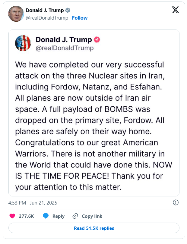 “Felicitaciones a nuestros grandes guerreros americanos. No hay otro ejército en el mundo que podría haber hecho esto. ¡AHORA ES EL MOMENTO DE LA PAZ!”, escribió el presidente de Estados Unidos.