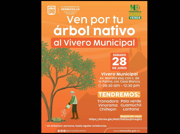 Hermosillo, Sonora; 24 de junio, 2025.-* El próximo sábado 28 de junio las y los hermosillenses tendrán una nueva oportunidad de recibir gratuitamente árboles nativos que podrán plantar en algún espacio público o privado de su preferencia, anunció Amparo Fontanot, directora de Parques y Jardines del Ayuntamiento de Hermosillo.