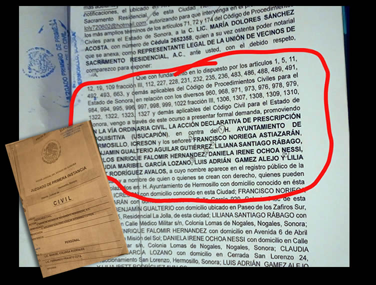 En fotografías difundidas por los mismos vecinos, se exhiben partes del expediente judicial, donde se mencionan a los supuestos compradores de los lotes, con apellidos como Astiazarán, Noriega y Aguilar. El terreno, en lugar de cumplir su función social como área verde, fue dividido y vendido en 23 partes. Y sin embargo, pese al juicio en curso, se pretende construir sobre él.