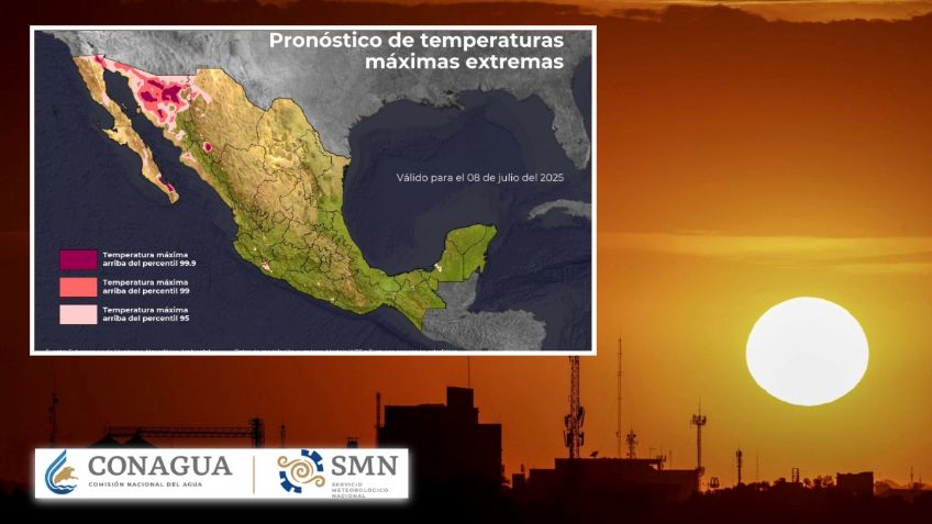 El Servicio Meteorológico Nacional (SMN) informó que continuará el ambiente caluroso a muy caluroso sobre estados del noroeste y norte del territorio nacional, así como en la Península de Yucatán, este martes 8 de julio de 2025, manteniéndose la onda de calor en el noreste de Baja California y el centro de Sonora donde las temperaturas máximas alcanzarán los 45 grados centígrados.