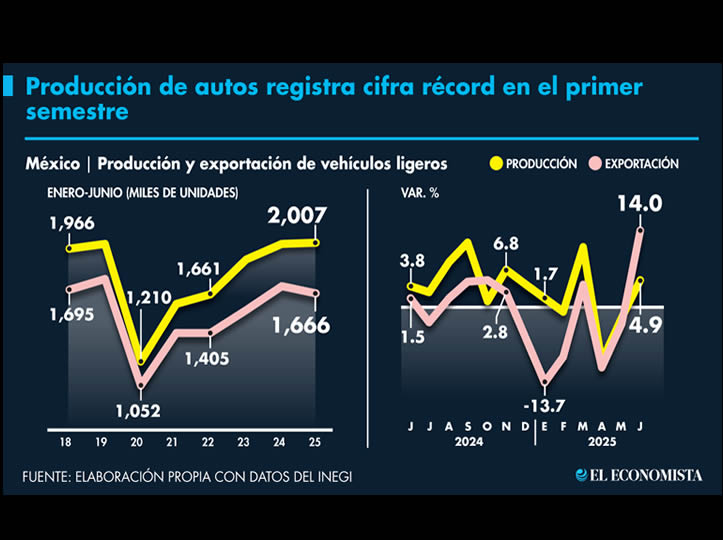 “Estamos comparando 2025 con 2024 y el anterior fue récord, pero con la coyuntura arancelaria ha habido impactos, el comportamiento de exportación y producción es menor inestable respecto a lo previsto, si bien hubo bajas en abril y mayo, junio, se recupera, pero hay que ser cautelosos, porque faltan acciones arancelarias que aplicará Estados Unidos”, especificó.