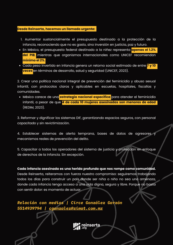 La organización Reinserta enfatizó que con base en datos de la Red por los Derechos de la Infancia (REDIM), más de 1,000 niñas, niños y adolescentes son asesinados cada año, lo que lamentablemente pone de manifiesto que nuestro país se enfrenta a la cotidianidad de la violencia que normaliza lo que jamás debió ni debe ser tolerado.