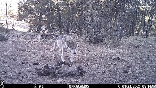 Lobo mexicano en actividad matutina registrado por cámara trampa en Chihuahua. Fotografía: Fundación Tonkawa Acres / Monitoreo 2025
