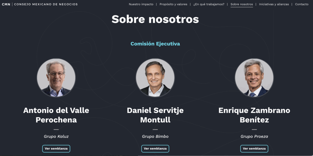 En la página del CMN figuran otros perfiles como el de Ana M Aguilar, Enrique Zambrano Benítez, Antonio del Valle, Daniel Servitje Montull, Emilio Carrillo Gamboa y Regina Gándara Mendoza. En el diagrama siguiente, se muestra la amplia red de miembros del Consejo del órgano de gobierno con distintos grupos empresariales e incluso dos think tanks opositores al gobierno de México en la actualidad y que, además, reciben financiamiento del gobierno Estados Unidos.