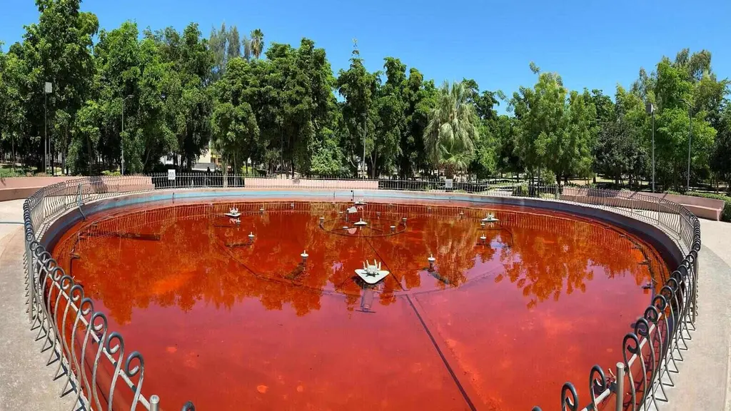 La fuente del Parque I. Madero amaneció con el agua pintada de rojo este domingo 13 de julio en Hermosillo; coincidiendo con la Marcha x la Justicia y la Dignidad que se llevará a cabo el día de hoy.