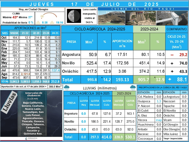 Aunado a esto, solo entre el 15 y 16 de julio, el sistema registró 23.3 millones de metros cúbicos adicionales, una señal positiva aunque aún insuficiente para una recuperación plena, ya que casi todo Sonora, en condición de sequía.