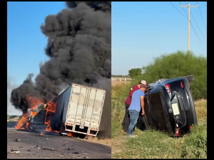 Hermosillo, Sonora.- Un choque entre un automóvil tipo sedán contra un tráiler dejó como saldo una persona fallecida y la unidad de carga incendiada.