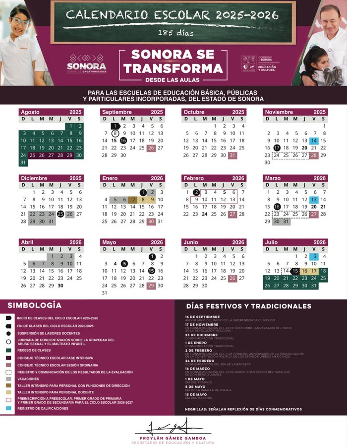 La Secretaria de Educación y Cultura dio a conocer el ciclo escolar 2025-2026 para las escuelas de educación básica, públicas y particulares incorporados, del estado de Sonora, el cual indica el inicio del ciclo escolar el 1 de septiembre del 2025 terminando el 15 de julio del 2026.