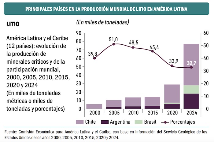 América Latina y el Caribe es la región ubicada como la segunda productora mundial de litio, con una participación del 33 por ciento. Chile se destaca como segundo productor mundial de litio, con el 20.8 por ciento, mientras que la Argentina es el cuarto productor mundial de litio con el 7.6 por ciento, y el Brasil el quinto, con el 4.2 por ciento.