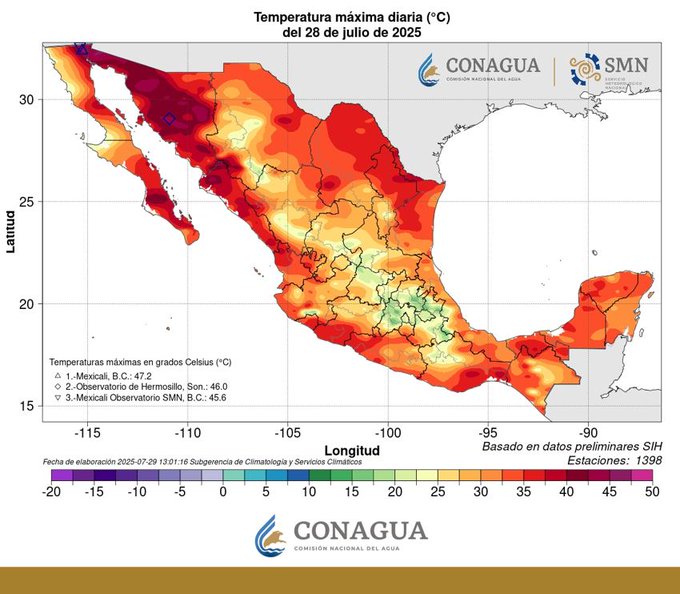 Según el informe emitido por el Organismo de Cuenca Noroeste, Dirección Técnica, de la Comisión Nacional del Agua (CONAGUA), la temperatura de 46.0°C se registró el pasado 24 de julio de 2025 en Hermosillo, rompió el récord previo para esta fecha, el cual era de 44.5°C en 2009.