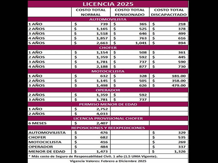 El valor aumenta dependiendo de la vigencia, cuya expedición es hasta de cuatro años, además, el costo de la licencia para chofer es de mil 154 pesos, para motociclistas cuesta 632 pesos, todas con vigencia de un año.