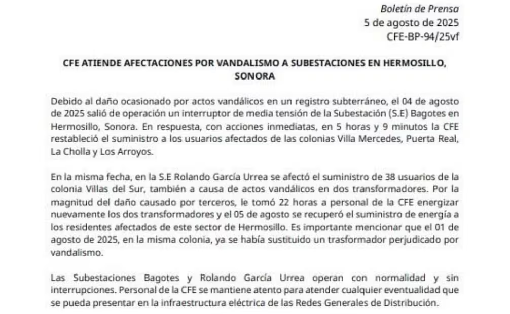 A través de un comunicado, la CFE detalló que, debido al daño ocasionado por actos vandálicos en un registro subterráneo, el 04 de agosto de 2025 salió de operación un interruptor de media tensión de la subestación Bagotes en Hermosillo, Sonora.