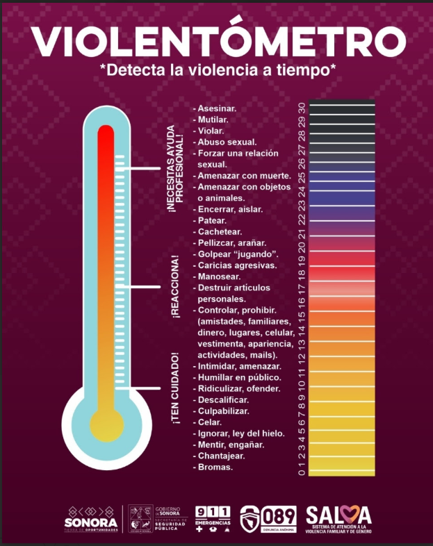 Comprometidos con la seguridad de las y los sonorenses, a través de operativos informativos por municipios, el Sistema SALVA comparte y explica a la ciudadanía la utilidad del Violentómetro, instrumento mediante el cual las personas pueden reconocer situaciones de alerta y tomar medidas preventivas.