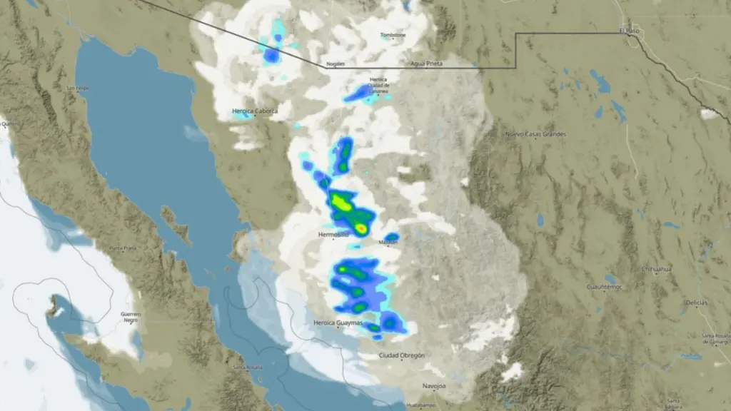 En la región sur, se pronostican tormentas en la sierra de Yécora que avanzarían hacia el poniente, cruzando por Tecoripa y Suaqui Grande, con probabilidad de alcanzar el Valle de Guaymas durante la noche.