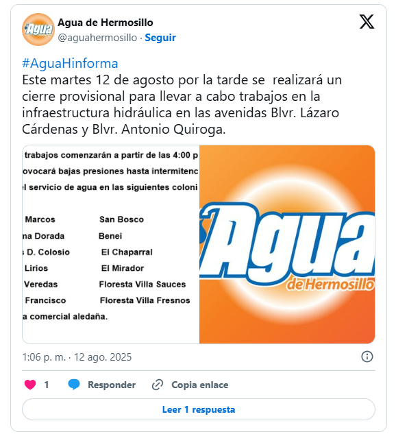 Agua de Hermosillo informó sobre la suspensión del servicio en estas colonias durante 8 horas debido a trabajos en la zona.