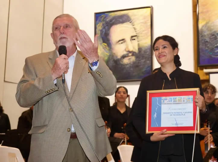 La Orquesta juvenil e infantil de Tecozautla, Hidalgo, amenizó este homenaje con cuatro canciones emblemáticas de la isla: Hasta siempre comandante, Guantanamera, La Lupe y De dónde son los cantantes. También se cantaron las mañanitas y se partió un pastel para celebrar el natalicio de Castro.