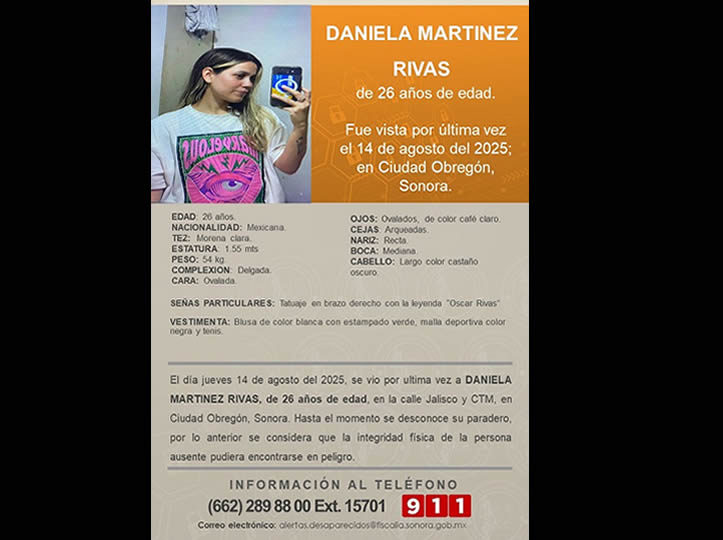 Hermosillo, Sonora.- Daniela Martínez Rivas, de 26 años de edad fue reportada como desaparecida en el municipio de Cajeme.