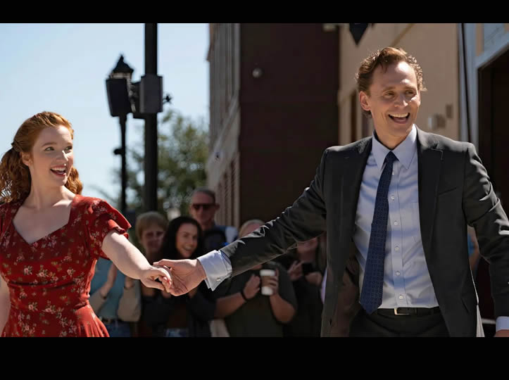Así es como La vida de Chuck imagina nuestro final: todos agradecidos, con susurros de “ha sido una buena vida” y sin grandes explosiones climáticas. Pero bueno, ¡olvidemos el apocalipsis y veamos bailar a Tom Hiddleston! Tanto el relato corto de King (de su colección de 2020, If It Bleeds) como la interpretación que Flanagan hace del material establecen a este misterioso hombre como una especie de pizarra en blanco, una figura en la que todos pueden proyectar sus pensamientos, sentimientos, alegrías y arrepentimientos mientras se enfrentan a la extinción total. Podrías pensar que también te espera una especie de versión de The Truman Show sobre la fama instantánea. Pero entonces retrocedemos al Segundo Acto, que se centra en la excursión de Chuck a Boston para una conferencia. Casualmente, pasa por delante de Pocket Queen (Taylor Franck), baterista que toca en la calle en una plaza del centro. Una mujer llamada Janice (Annalise Basso de Snowpiercer) acaba de ser dejada por mensaje de texto. Se pone en marcha un ritmo funky. Chuck de repente se lanza a un baile improvisado. Saca a Janice de entre la multitud y, como era de esperar, tenemos un buen y clásico pas de deux.