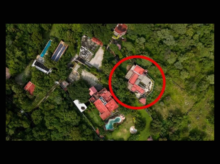 Si se observa desde arriba, en un sobrevuelo con dron, se percibe un reducido grupo de viviendas rodeadas de vegetación y árboles. Dentro de la propiedad del legislador destaca una casa grande y un amplio jardín.
