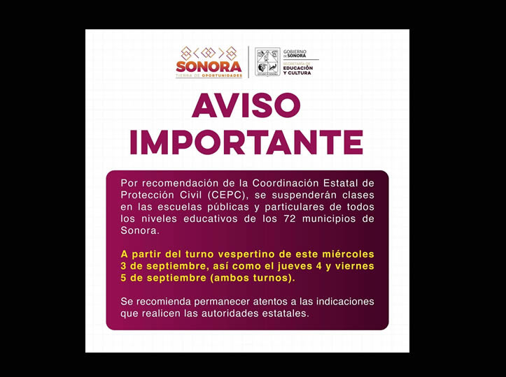 A partir del turno vespertino de este miércoles 3 de septiembre se suspenden clases en las escuelas públicas y particulares de todos los niveles educativos en los 72 municipios de Sonora, por recomendación de la Coordinación Estatal de Proteccion Civil (CEPC).