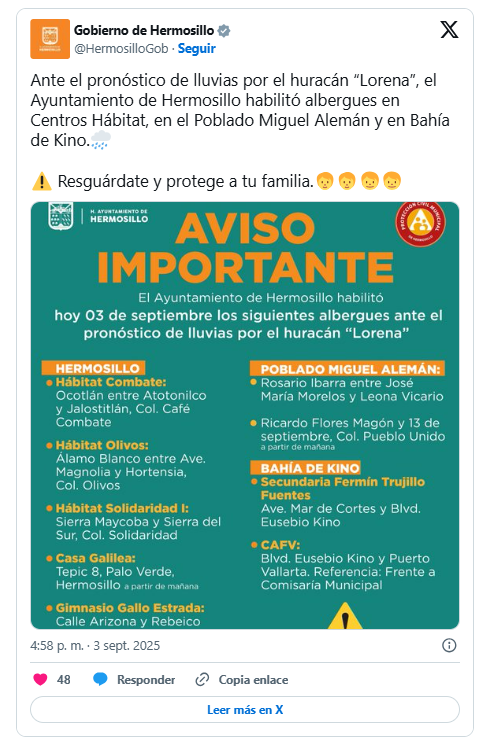 ENLACE: Huracán Lorena 2025: Lista de Albergues en Hermosillo, Sonora y Ubicación | N+
