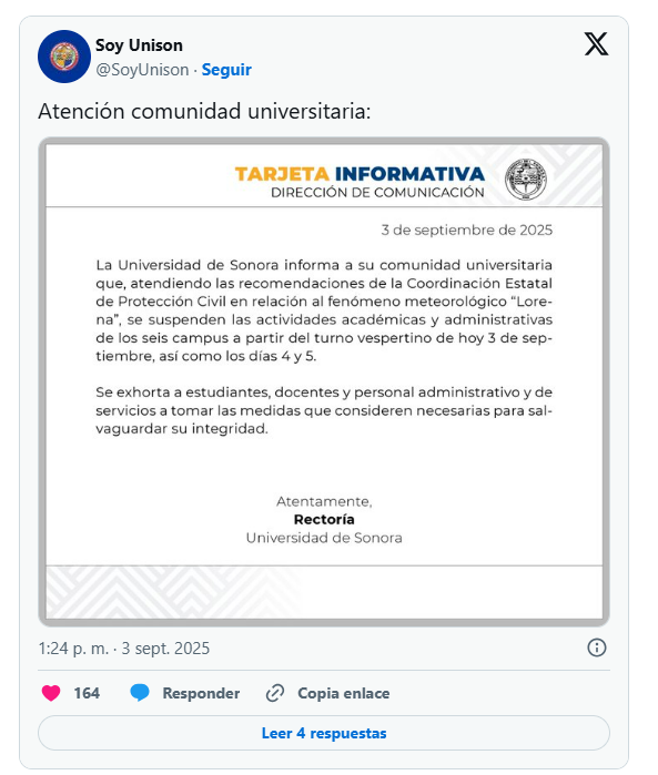 La Universidad de Sonora informó esta tarde la suspensión de las actividades académicas y administrativas en los seis campus, a partir del turno vespertino de hoy, en atención a las recomendaciones emitidas por la Unidad Estatal de Protección Civil ante el fenómeno meteorológico “Lorena”.