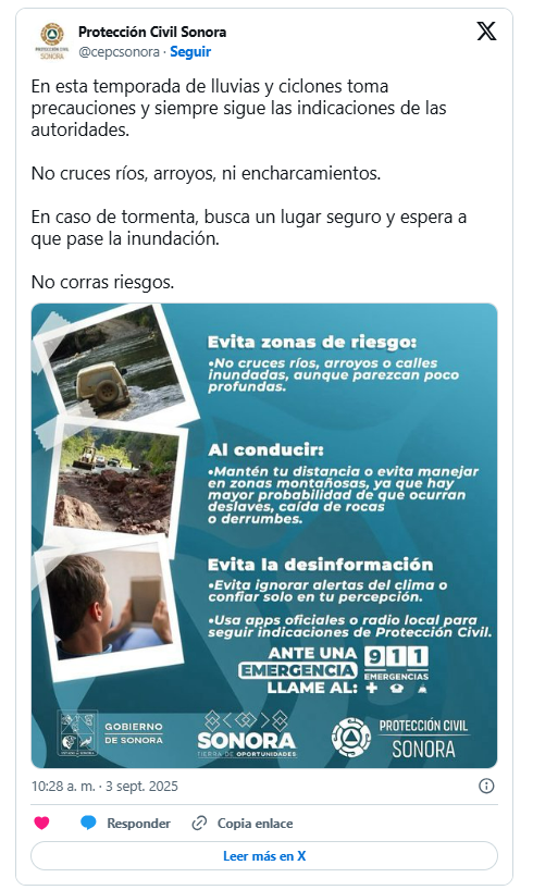 La Unidad Estatal de Protección Civil emitió una serie de recomendaciones tras las lluvias que han afectado el estado de Sonora y ante el pronóstico para los próximos días.